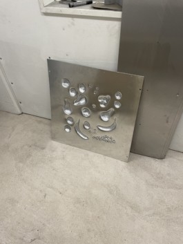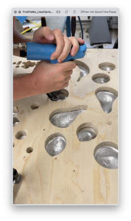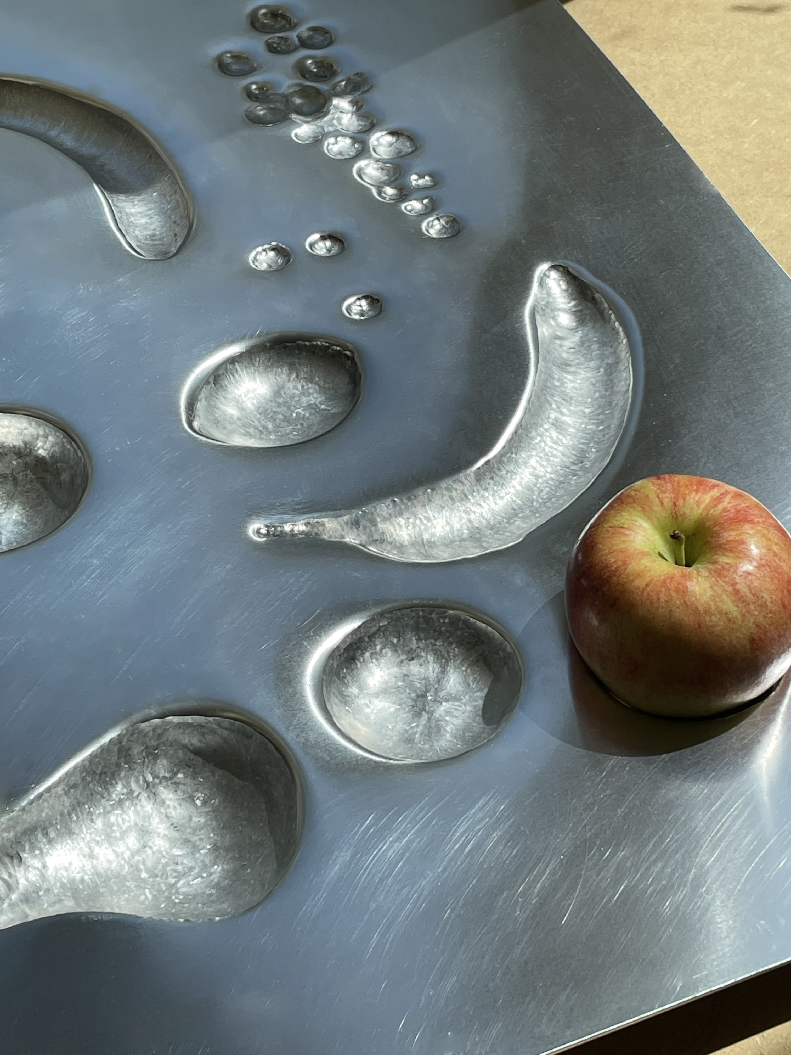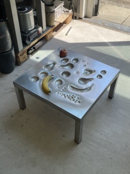 Contrary to the actually so universal piece of furniture, Fruit Table embodies one particular use. On it fruits leave a pronounced contour in the surface on the once flat aluminum plate pressing into the metal. The negative of each fruit becomes an integral part of the typology. Table and meal merge. The metal surface of the table engages with the common way of making eating utensils and vessels from antiquity. These are often forms that were adapted to the contour of the meal.